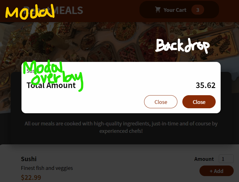 //Cart.js import Modal from '../UI/Modal'; const Cart = props => { return ( <Modal onClick={props.onClose}> <div className='total'> <span>Total Amount</span> <span>35.62</span> </div> <div className='actions'> <button className='button--alt'>Close</button> <button className='button' onClick={props.onClose}> close</button> </div> </Modal>) }; export default Cart;Modal.js로 받은 props 함수를 BackDrop 컴포넌트로 전달해준다.