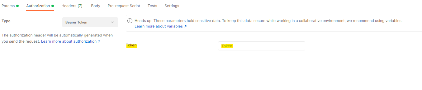 POSTMAN의 Authorize Access Token 로 받은 토큰을 입력하면 된다.